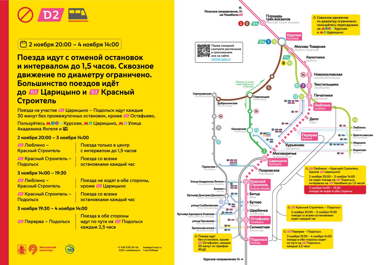 С вечера 2 ноября (после 20.00) по 3 ноября (до 14.00) от станции Люблино до Красного Строителя не будет движения поездов «на Подольск» на станциях Депо, Перерва, Курьяново, Москворечье и Покровское. Поезда «на Нахабино» будут ходить с интервалом до 1,5 часов.